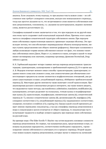 Данная статья посвящена исследованию способов перевода антропонимов в текстах игровой и компьютерной направленности и сложностей, с которыми сталкиваются переводчики. Целью исследования является анализ методов перевода антропонимов при локализации игры «Скайрим», а также обобщение данных о приемах, которые были использованы при переводе имен собственных. В статье упоминаются методы, которые тоже могут применяться при локализации, но не имеют особой популярности. Всего было проанализировано 904 антропонима. Сфера применяемости результатов - обучающие пособия по практике перевода и локализации игр.