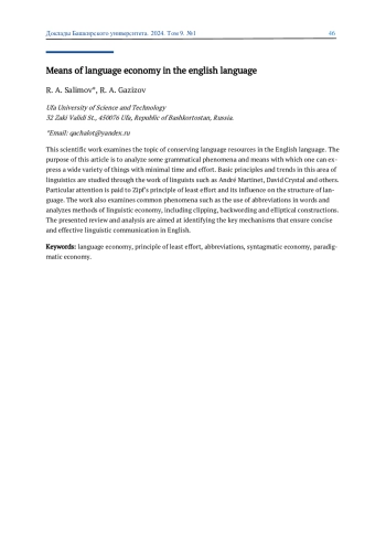 САЛИМОВ Р. А., ГАЗИЗОВ Р. А. СРЕДСТВА ЯЗЫКОВОЙ ЭКОНОМИИ В АНГЛИЙСКОМ ЯЗЫКЕ // ДОКЛАДЫ БАШКИРСКОГО УНИВЕРСИТЕТА. 2024. Т. 9 № 1