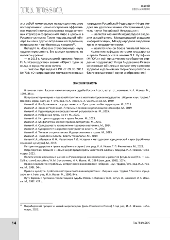 В статье анализируется творческий путь Игоря Андреевича Исаева — авторитетного ученого в области истории государства и права, философии права, теории государства и права. Предпринята попытка проследить этапы становления И. А. Исаева как исследователя, формирование и трансформацию его научных интересов, проанализированы основные идеи и выводы, которыми руководствовался юбиляр. Предложен анализ его основных трудов с указанием ключевых мыслей, повлиявших на формирование соответствующих сфер научного познания. Отмечены его идеи, ставшие основой для многих современных теорий и научных школ. Несмотря на то что И. А. Исаев прошел непростой преподавательский и профессиональный путь, его творческий пытливый ум всегда занимали сложные и важные вопросы — в области как теории права, так и теории государства, истории права и философии. Наибольший научный интерес вызывали проблемы, связанные с взаимодействием власти и государства. Вклад И. А. Исаева в науку и ее развитие неоценим, и как один из способов отдать дань уважения творчеству великого мастера подготовлена настоящая работа.