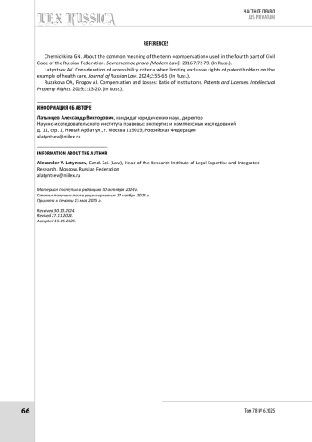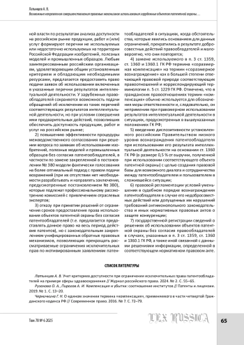 1. Латынцев А. В. Учет критериев доступности при ограничении исключительных права патентообладателей на примере сферы здравоохранения // Журнал российского права. 2024. № 2. С. 55-65.