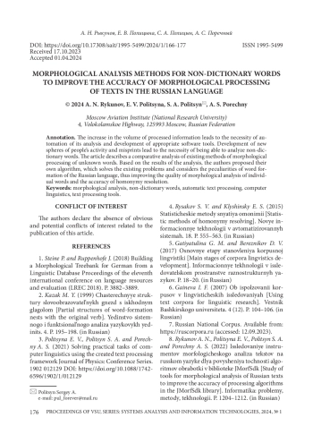 8. Рыкунов А. Н. Исследование инструментов морфологического анализа текстов на русском языке для повышения точности алгоритмов обработки в библиотеке JMorfSdk / А. Н. Рыкунов, E. В. Полицына, С. А. Поли-цын, А. С. Поречный // Информатика: проблемы, методы, технологии. - 2022. - С. 12041212. EDN: QKISHK