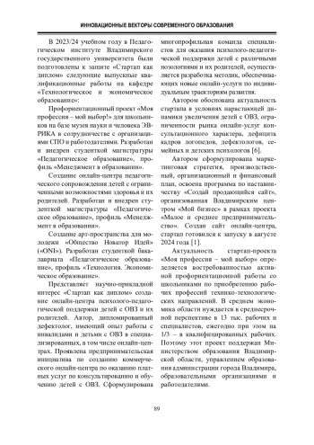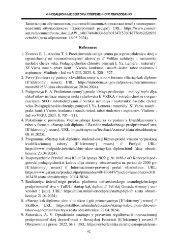 1. Зверева Е. И., Аравина Т. И. Проектирование онлайн-центра по сопровождению детей с ограниченными возможностями здоровья // Великие учителя и наставники: наследие через века. Педагогические чтения памяти И. Я. Лернера : материалы XI Всрос. науч.-практ. конф. и Всерос. конкурса и науч.-исслед. работ студентов и аспирантов. Владимир : Изд-во ВлГУ, 2023. С. 320 - 327.