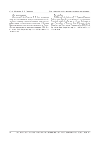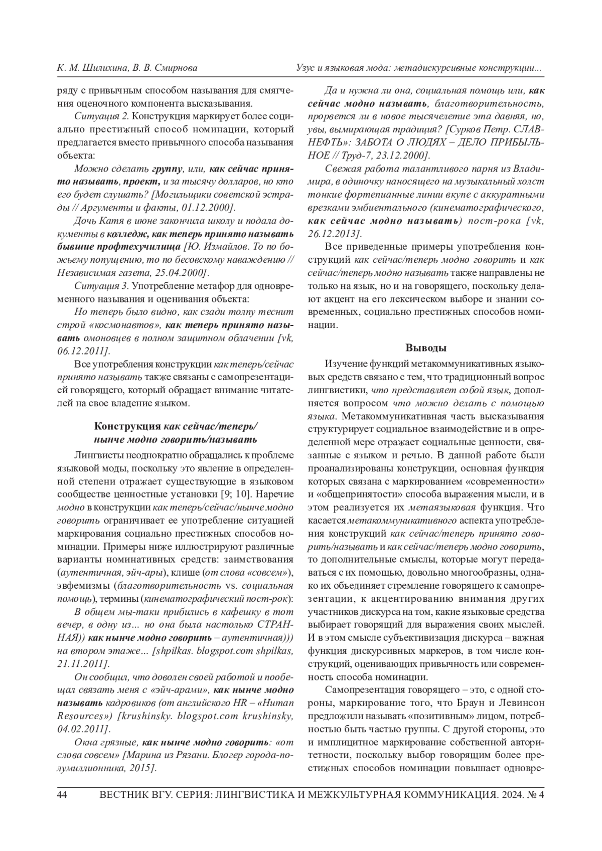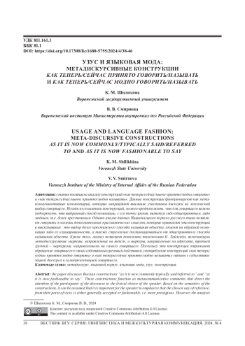 В данной статье анализируется функционирование ряда конструкций, с помощью которых говорящие эксплицируют свою оценку того, насколько общепринятыми/современными (модными) они считают употребляемые речевые средства – это конструкции как теперь/сейчас/нынче принято/модно говорить и как теперь/сейчас/нынче принято/модно называть. Разумеется, список конструкций, маркирующих узуальность/престижность выбранного способа номинации, не является исчерпывающим, однако, на наш взгляд, функционирование этих конструкций является наглядной иллюстрацией таких эксплицитных метакоммуникативных действий. Интересующие нас конструкции связаны с вниманием носителей языка к узусу, с одной стороны, и к появлению в языке новых способов номинации – с другой. Однако указание на узуальность или социальный престиж (моду) выбранного способа номинации может быть не единственной прагматической целью говорящего. В связи с этим цель данного анализа – показать, какие дополнительные смыслы вносят в высказывания данные конструкции.