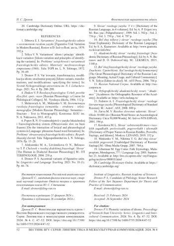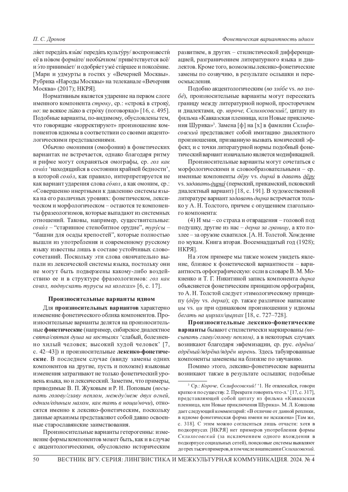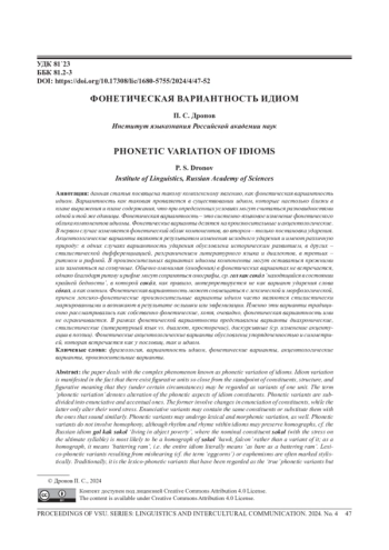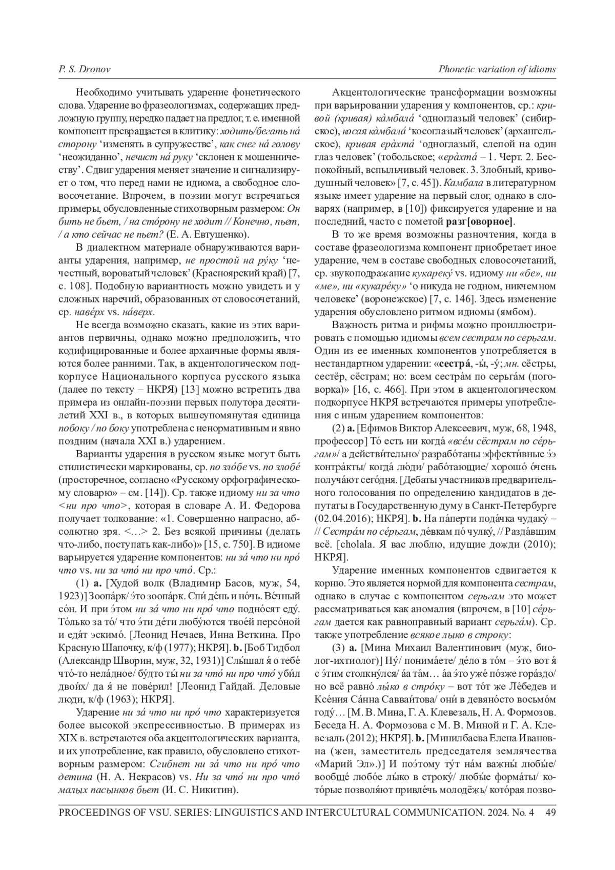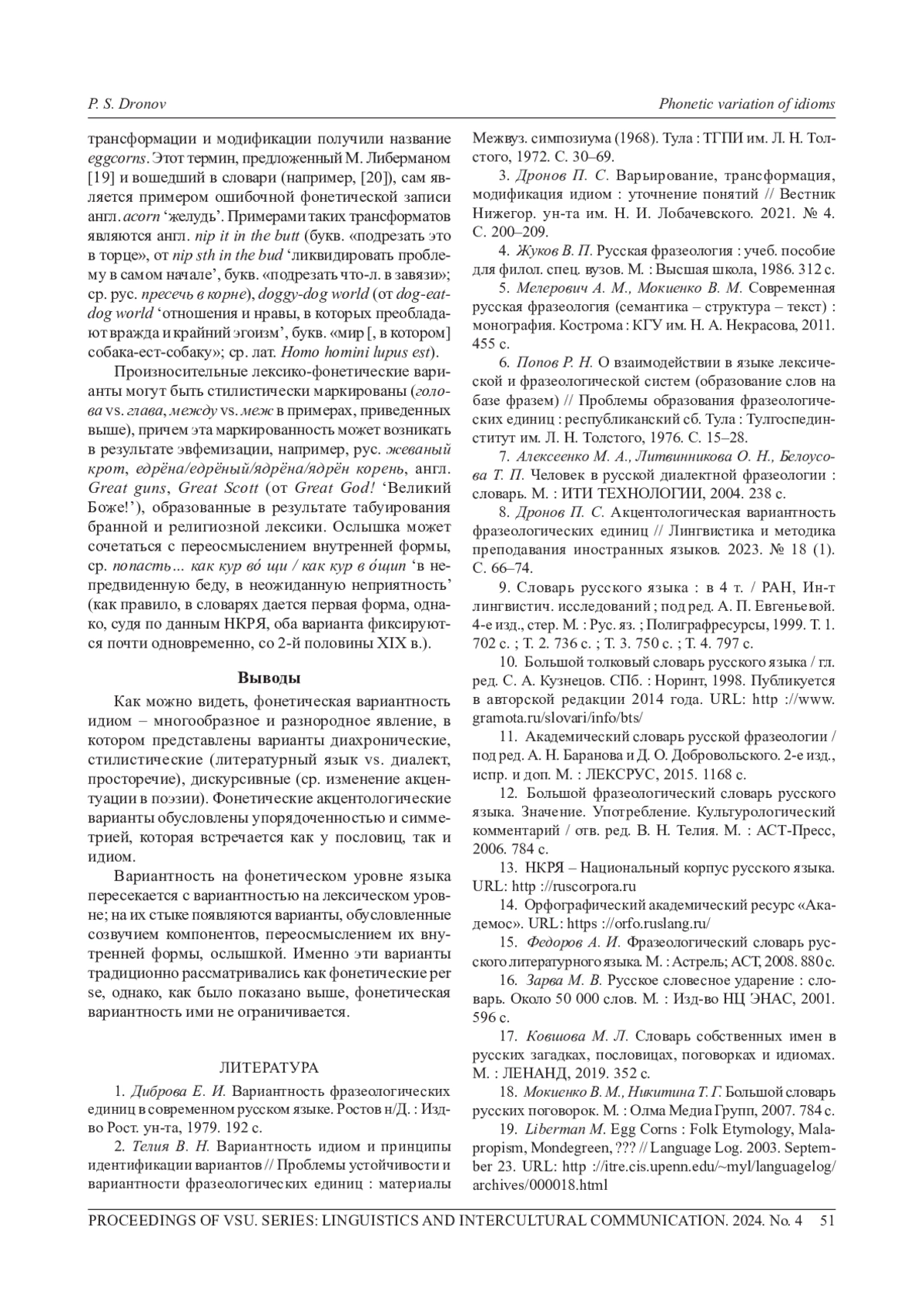 8. Дронов П. С. Акцентологическая вариантность фразеологических единиц // Лингвистика и методика преподавания иностранных языков. 2023. № 18 (1). С. 66-74. EDN: NUBXQU