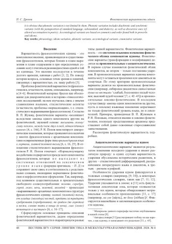 Данная статья посвящена такому комплексному явлению, как фонетическая вариантность идиом. Вариантность как таковая проявляется в существовании идиом, которые настолько близки в плане выражения и плане содержания, что при определенных условиях могут считаться разновидностями одной и той же единицы. Фонетическая вариантность - это системно-языковое изменение фонетического облика компонентов идиомы. Фонетические варианты делятся на произносительные и акцентологические. В первом случае изменяется фонетический облик компонентов, во втором - только постановка ударения. Акцентологические варианты являются результатом изменения исходного ударения и имеют различную природу: в одних случаях вариантность ударения обусловлена историческим развитием, в других -стилистической дифференциацией, разграничением литературного языка и диалектов, в третьих -ритмом и рифмой. В произносительных вариантах идиомы компоненты могут оставаться прежними или заменяться на созвучные. Обычно омонимия (омофония) в фонетических вариантах не встречается, однако благодаря ритму и рифме могут сохраняться омографы, ср. гол как сокол ‘находящийся в состоянии крайней бедности ’, в которой сокол, как правило, интерпретируется не как вариант ударения слова сокол, а как омоним. Фонетическая вариантность может совмещаться с лексической и морфологической, причем лексико-фонетические произносительные варианты идиом часто являются стилистически маркированными и возникают в результате ослышки или эвфемизации. Именно эти варианты традиционно рассматривались как собственно фонетические, хотя, очевидно, фонетическая вариантность ими не ограничивается. В рамках фонетической вариантности представлены варианты диахронические, стилистические (литературный языку», диалект, просторечие), дискурсивные (ср. изменение акцентуации в поэзии). Фонетические акцентологические варианты обусловленыупорядоченностью и симметрией, которая встречается как у пословиц, так и идиом.