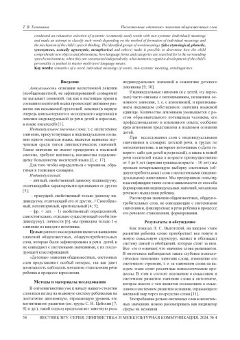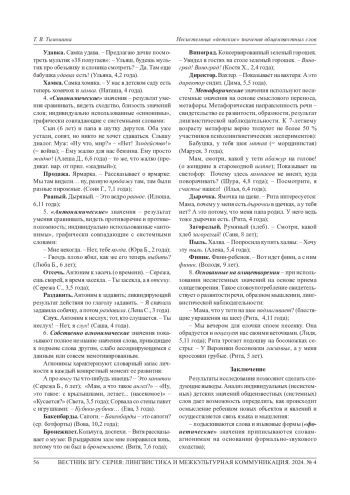 Данная статья посвящена исследованию семантики слов в детской речи, рассмотрению индивидуальных значений слов у детей, которые используют общеизвестные слова в их собственных, «детских» значениях, неизвестных другим носителям языка (иначе говоря, в значениях несистемных). Такие значения активизируются в сознании носителей языка в индивидуальном использовании в речи детей и взрослых, в молодежном и компьютерном жаргонах и т. д. Индивидуальное значение слова, т. е. несистемное значение, присутствующее в индивидуальном сознании одного носителя языка, является наименее изученным среди типов лингвистических значений. Такие значения не имеют прецедента в языковой системе, требуют контекста, неизвестны подавляющему большинству носителей языка. «Детские» значения общеизвестных, системных слов представляют особый интерес, так как дают возможность наблюдать механизм становления речи ребенка в процессе взросления. При исследовании слов с индивидуальными значениями в словарях детской речи, в трудах по онтолингвистике, в интернет-источниках («Дети говорят»: сайт для детей и родителей), а также в живой речи носителей языка в возрасте преимущественно от 3 до 8 лет мы провели исчерпывающую выборку системных (общеупотребительных) слов с несистемными (индивидуальными) значениями и предприняли попытку классификации таких слов в зависимости от способа формирования индивидуальных значений и механизма речевого мышления ребенка. Выявленные группы значений слов (ложно-этимологические, фонетические, синонимические, собственно агнонимические, метафорические и др.) позволяют определить, как происходит осмысление ребенком новых объектов и явлений, как подыскиваются языковые формы и категории в окружающей речевой среде, когда они конструируются самостоятельно, какие моменты когнитивного развития личности ребенка подталкивают к освоению разноуровневых языковых средств.