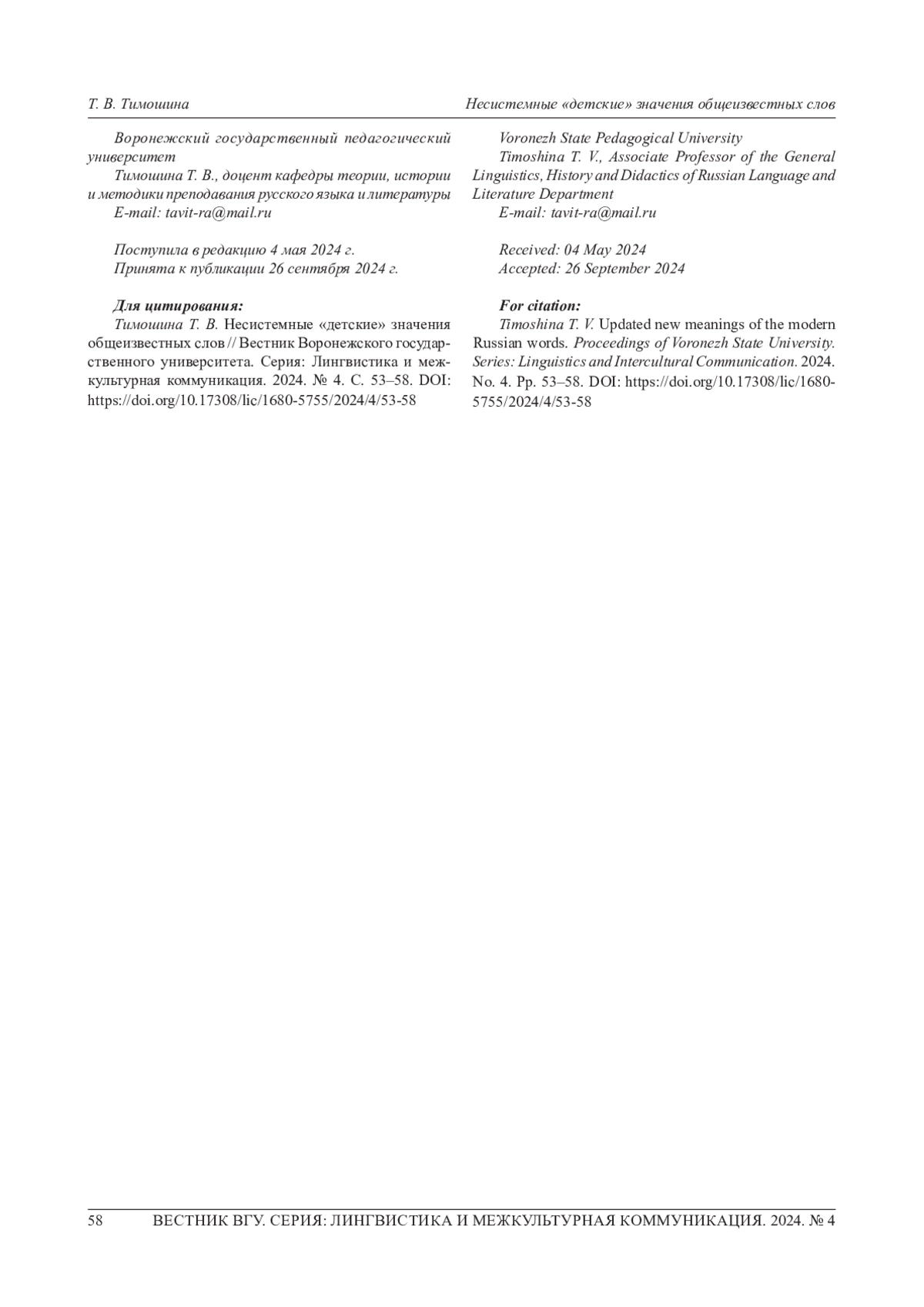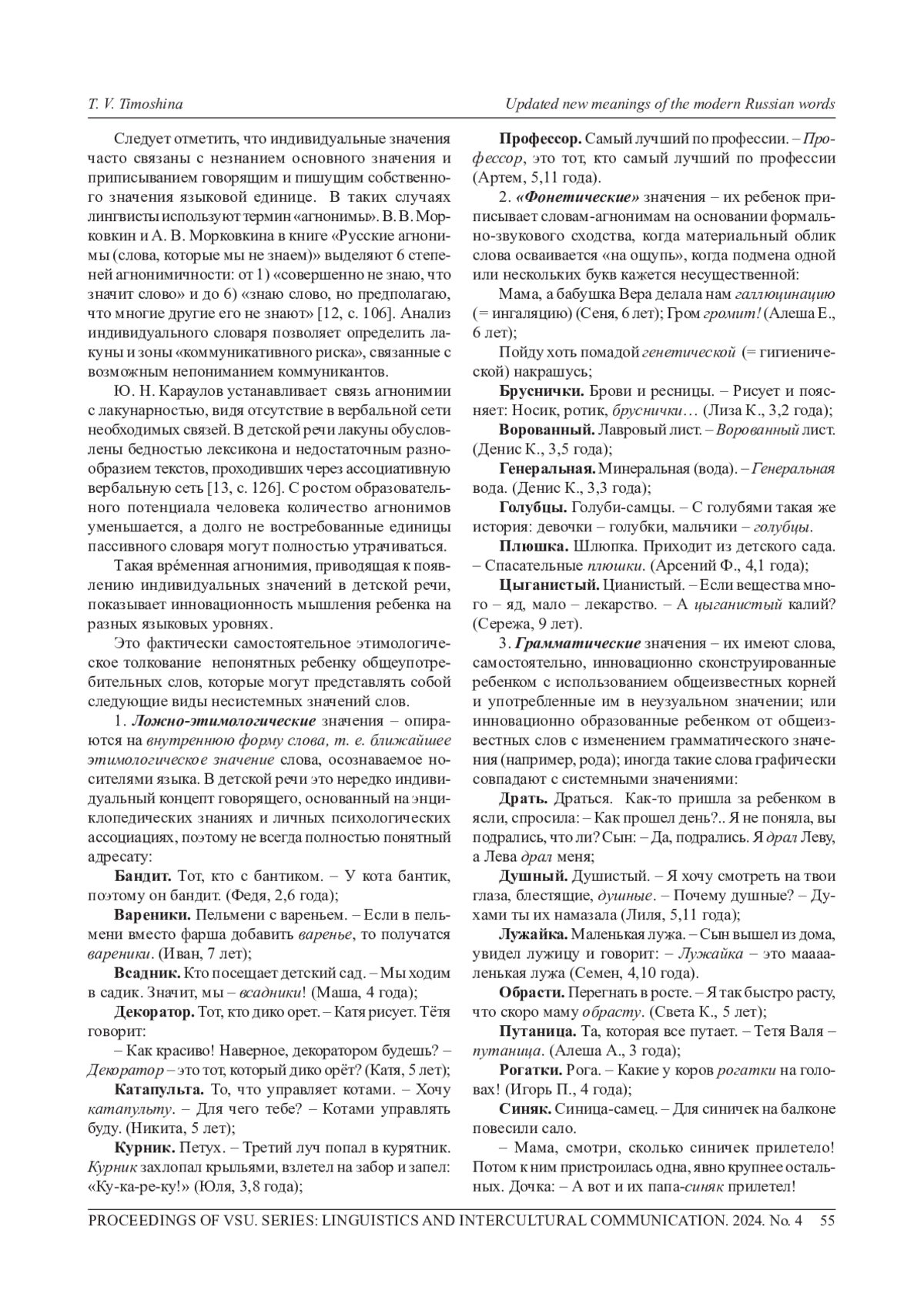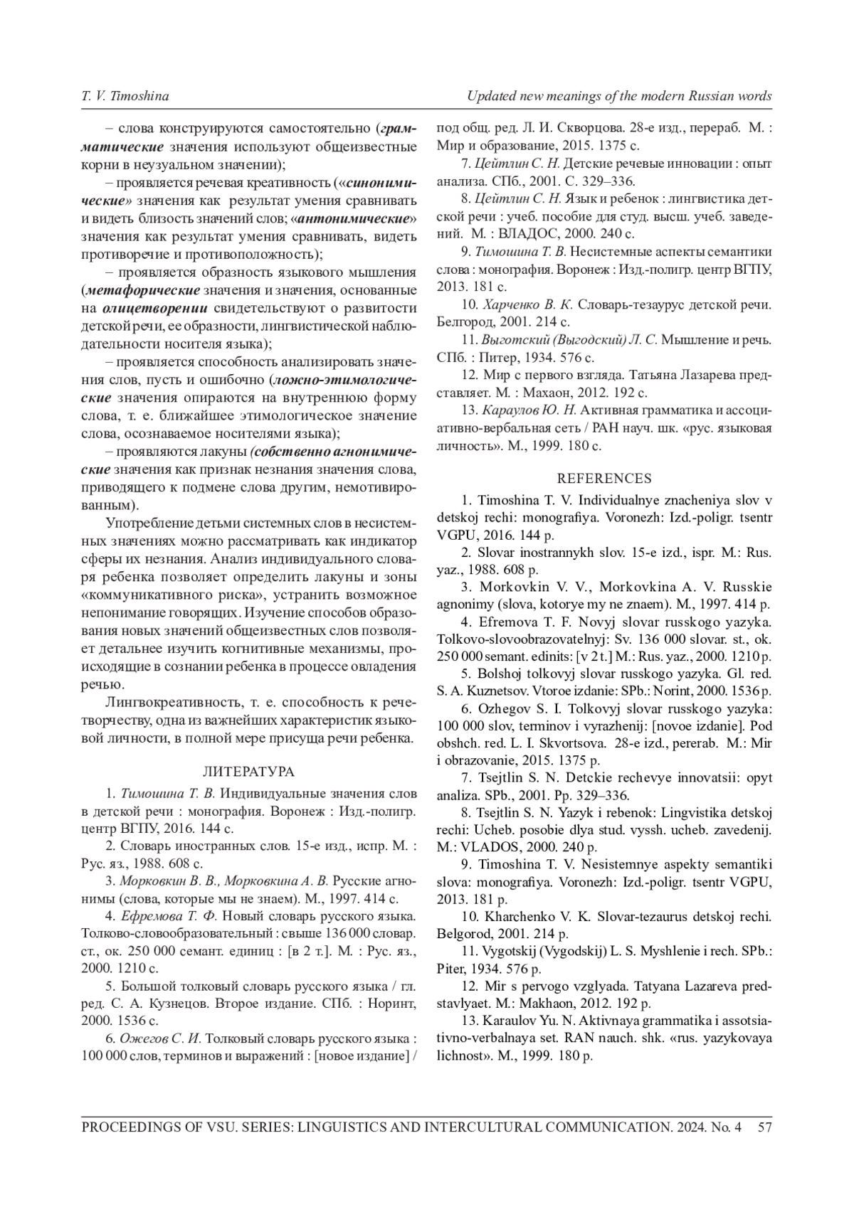 1. Тимошина Т. В. Индивидуальные значения слов в детской речи: монография. Воронеж: Изд.-полигр. центр ВГПУ, 2016. 144 с.
