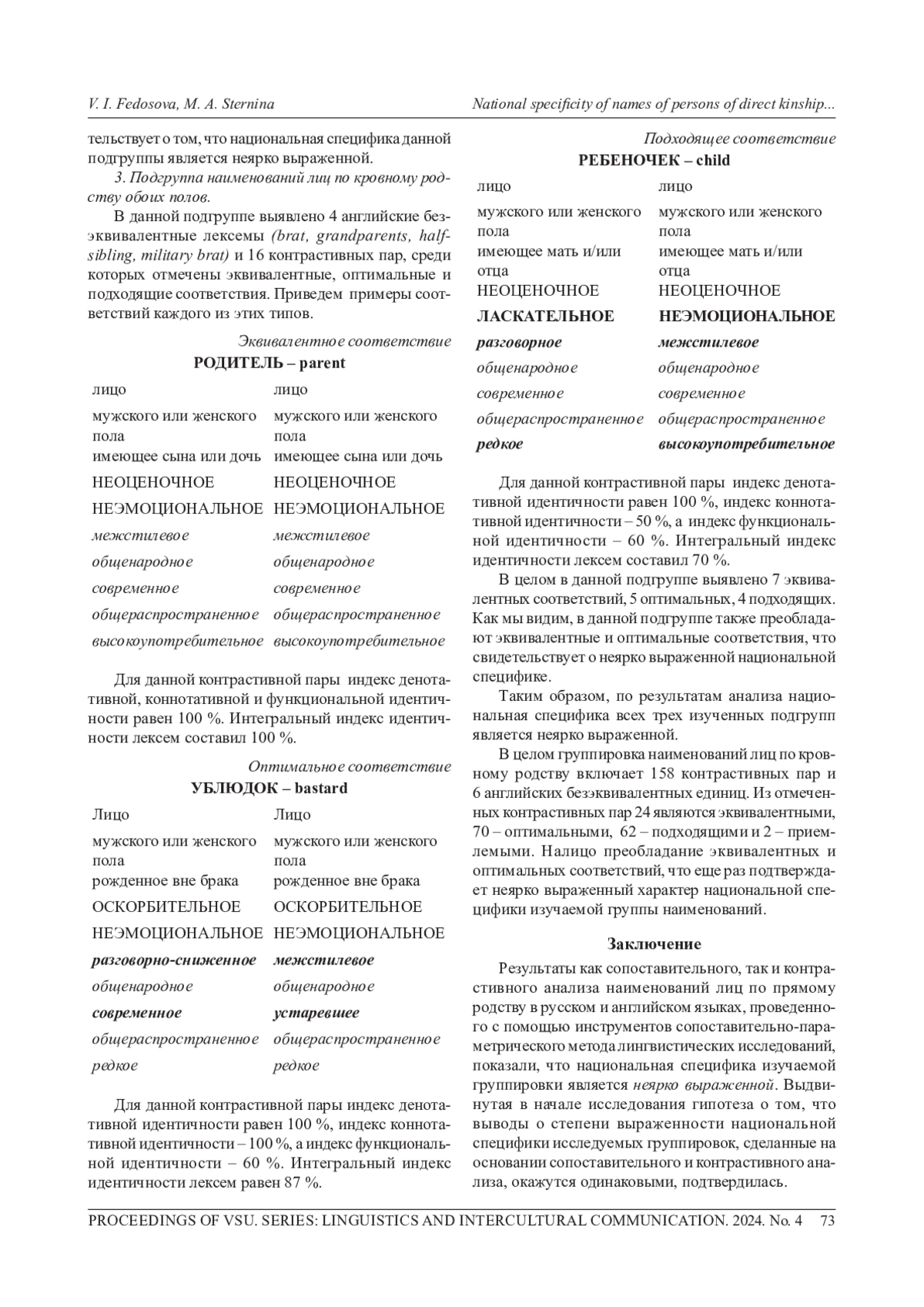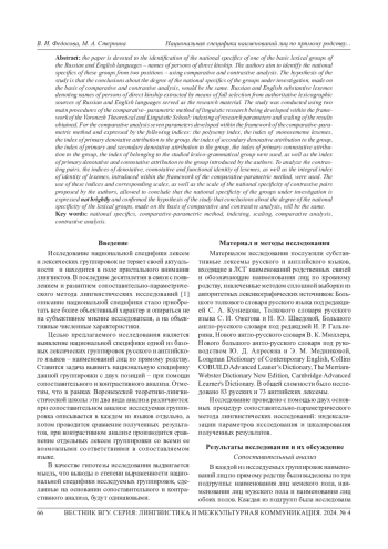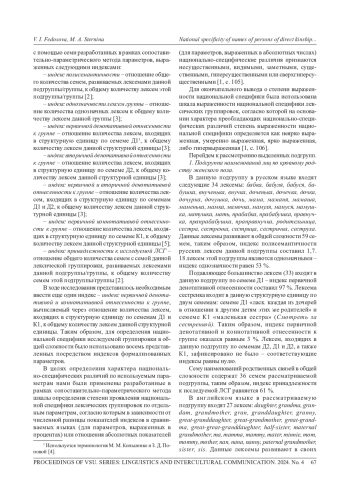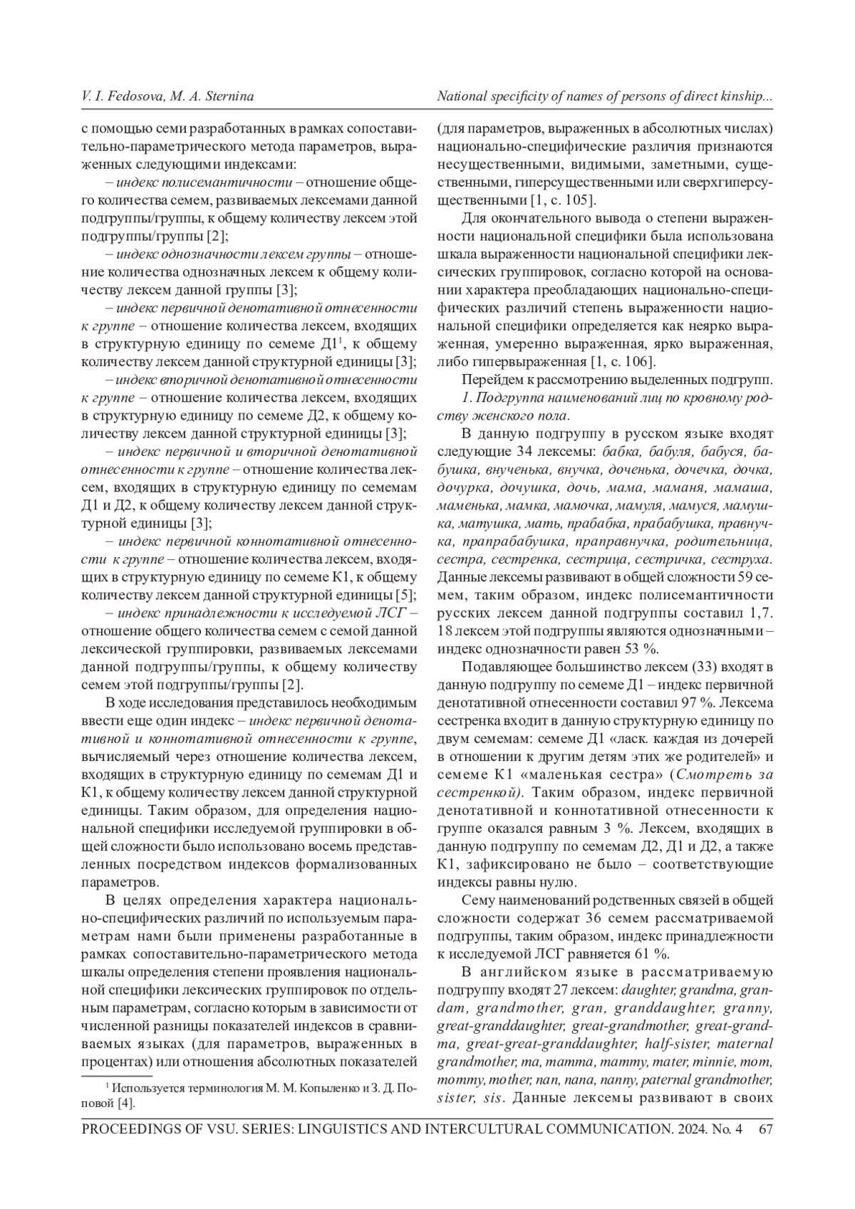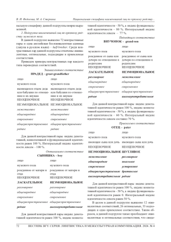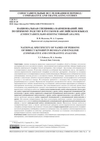 ФЕДОСОВА В. И., СТЕРНИНА М. А. НАЦИОНАЛЬНАЯ СПЕЦИФИКА НАИМЕНОВАНИЙ ЛИЦ ПО ПРЯМОМУ РОДСТВУ В РУССКОМ И АНГЛИЙСКОМ ЯЗЫКАХ (СОПОСТАВИТЕЛЬНО-КОНТРАСТИВНЫЙ АНАЛИЗ) // ВЕСТНИК ВОРОНЕЖСКОГО ГОСУДАРСТВЕННОГО УНИВЕРСИТЕТА. СЕРИЯ: ЛИНГВИСТИКА И МЕЖКУЛЬТУРНАЯ КОММУНИКАЦИЯ. 2024. № 4