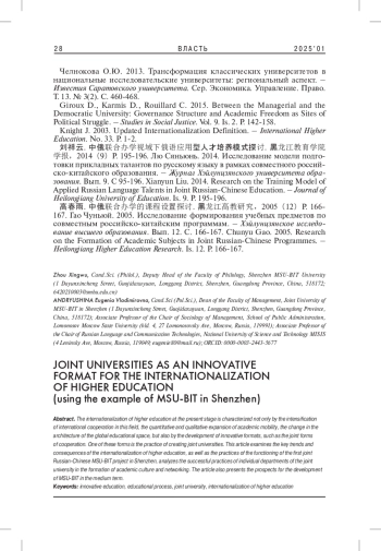 Статья: СОВМЕСТНЫЕ УНИВЕРСИТЕТЫ КАК ИННОВАЦИОННЫЙ ФОРМАТ ИНТЕРНАЦИОНАЛИЗАЦИИ ВЫСШЕГО ОБРАЗОВАНИЯ (НА ПРИМЕРЕ СОВМЕСТНОГО УНИВЕРСИТЕТА МГУ-ППИ В ШЭНЬЧЖЭНЕ) (2025)