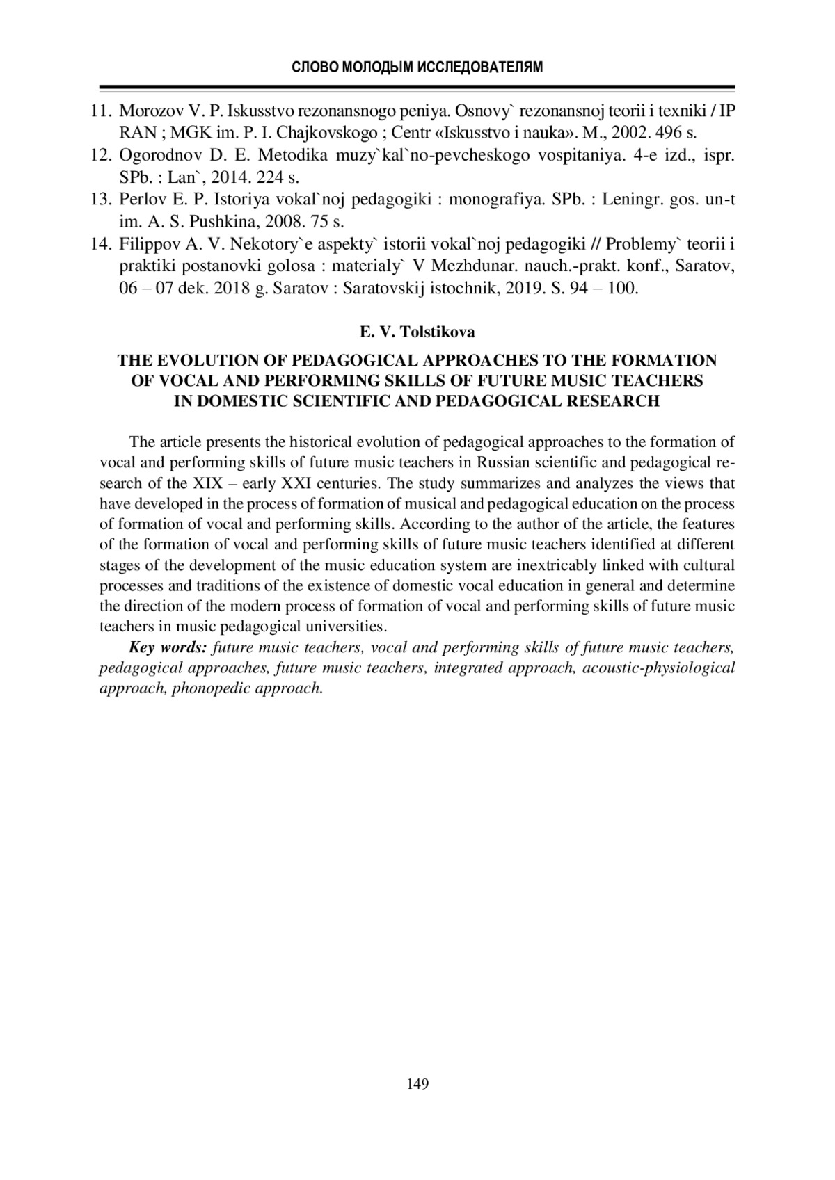 ТОЛСТИКОВА Е. В. ЭВОЛЮЦИЯ ПЕДАГОГИЧЕСКИХ ПОДХОДОВ К ФОРМИРОВАНИЮ ВОКАЛЬНО-ИСПОЛНИТЕЛЬСКИХ НАВЫКОВ БУДУЩИХ ПЕДАГОГОВ-МУЗЫКАНТОВ // ВЕСТНИК ВЛАДИМИРСКОГО ГОСУДАРСТВЕННОГО УНИВЕРСИТЕТА ИМ. АЛЕКСАНДРА ГРИГОРЬЕВИЧА И НИКОЛАЯ ГРИГОРЬЕВИЧА СТОЛЕТОВЫХ. СЕРИЯ: ПЕДАГОГИЧЕСКИЕ И ПСИХОЛОГИЧЕСКИЕ НАУКИ. 2024. №3