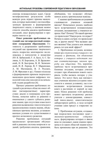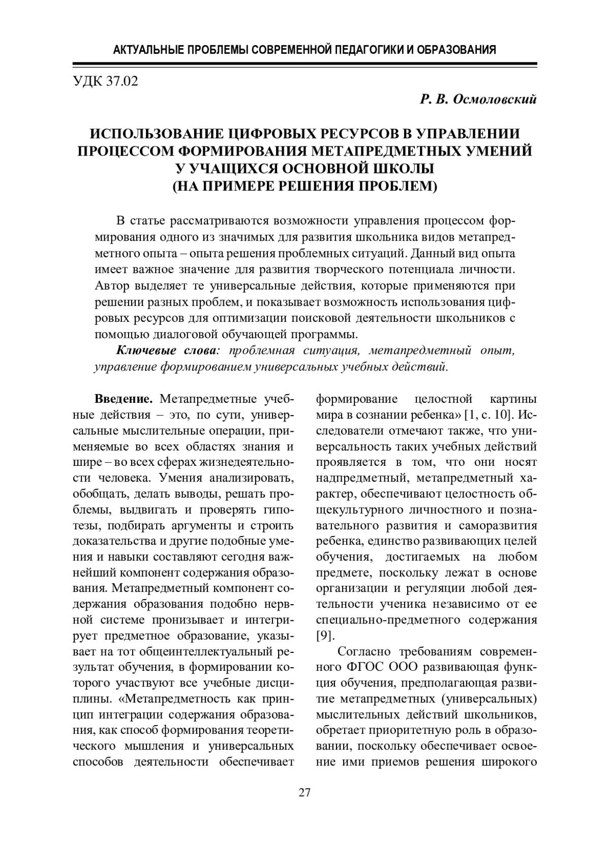 В статье рассматриваются возможности управления процессом формирования одного из значимых для развития школьника видов метапредметного опыта – опыта решения проблемных ситуаций. Данный вид опыта имеет важное значение для развития творческого потенциала личности. Автор выделяет те универсальные действия, которые применяются при решении разных проблем, и показывает возможность использования цифровых ресурсов для оптимизации поисковой деятельности школьников с помощью диалоговой обучающей программы.