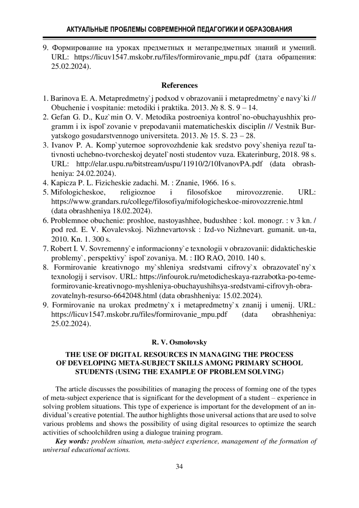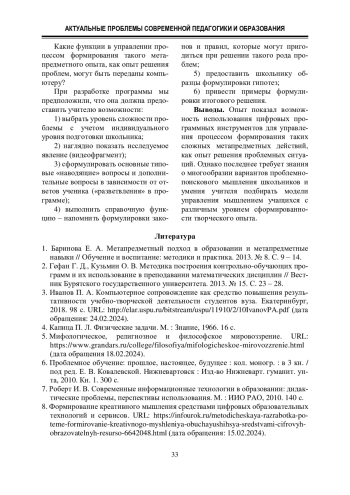 1. Баринова Е. А. Метапредметный подход в образовании и метапредметные навыки // Обучение и воспитание: методики и практика. 2013. № 8. С. 9 - 14.