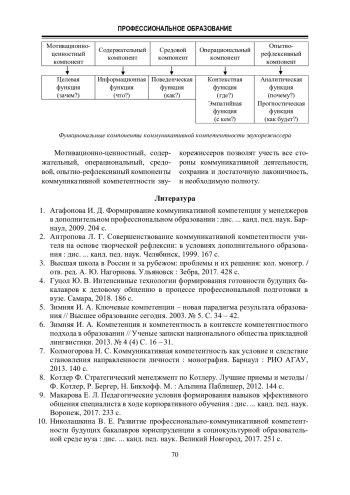 1. Агафонова И. Д. Формирование коммуникативной компетенции у менеджеров в дополнительном профессиональном образовании : дис. ... канд. пед. наук. Барнаул, 2009. 204 с.