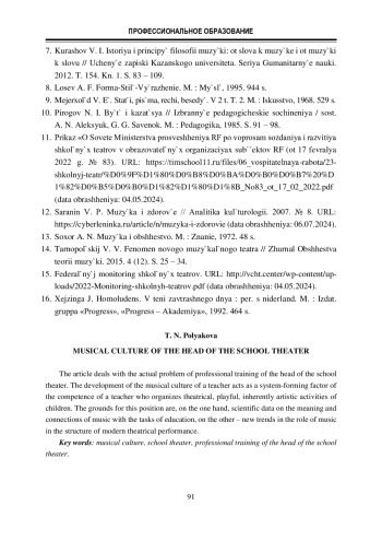 В статье рассматривается актуальная проблема профессиональной подготовки руководителя школьного театра. Развитие музыкальной культуры педагога выступает системообразующим фактором компетентностей педагога, организующего театрально-игровую, полихудожественную по своей сути деятельность детей. Основаниями такого положения являются, с одной стороны, научные данные о значении и связях музыки с задачами образования, с другой – новые тенденции роли музыки в структуре современного театрального представления.