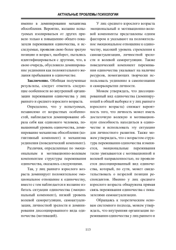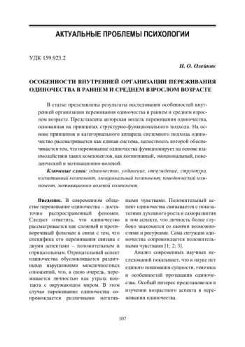В статье представлены результаты исследования особенностей внутренней организации переживания одиночества в раннем и среднем взрослом возрасте. Представлена авторская модель переживания одиночества, основанная на принципах структурно-функционального подхода. На основе принципов и категориального аппарата системного подхода одиночество рассматривается как единая система, целостность которой обеспечивается тем, что переживание одиночества функционирует на основе взаимодействия таких компонентов, как когнитивный, эмоциональный, поведенческий и мотивационно-волевой.