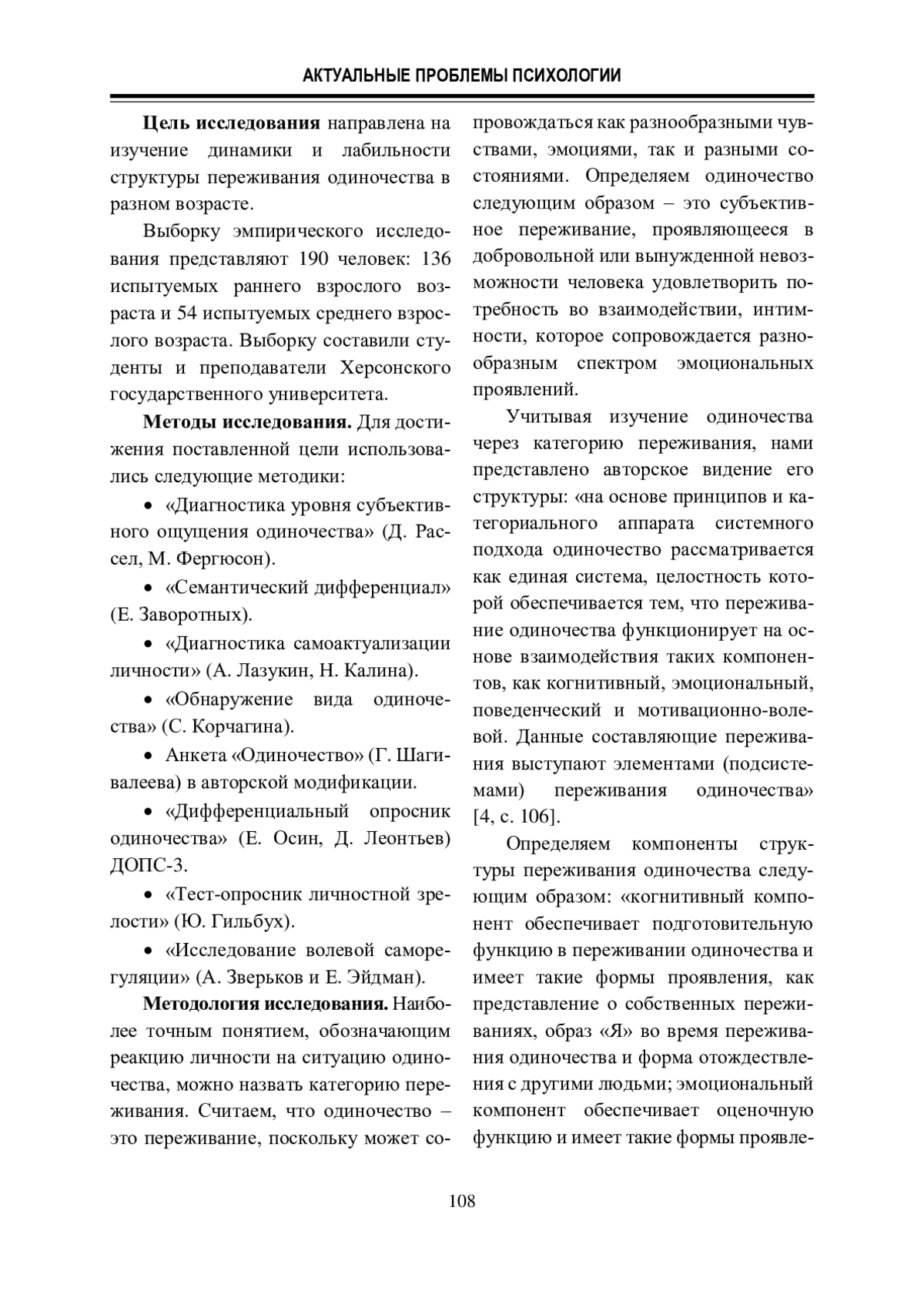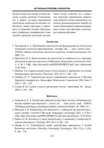 2. Муртазина И. Р. Представления об одиночестве и особенности его переживания в разные периоды взрослости // Мир науки. Педагогика и психология. 2021. Т. 9. № 3. URL: https://mir-nauki.com/PDF/42PSMN321.pdf (дата обращения: 12.01.2024).