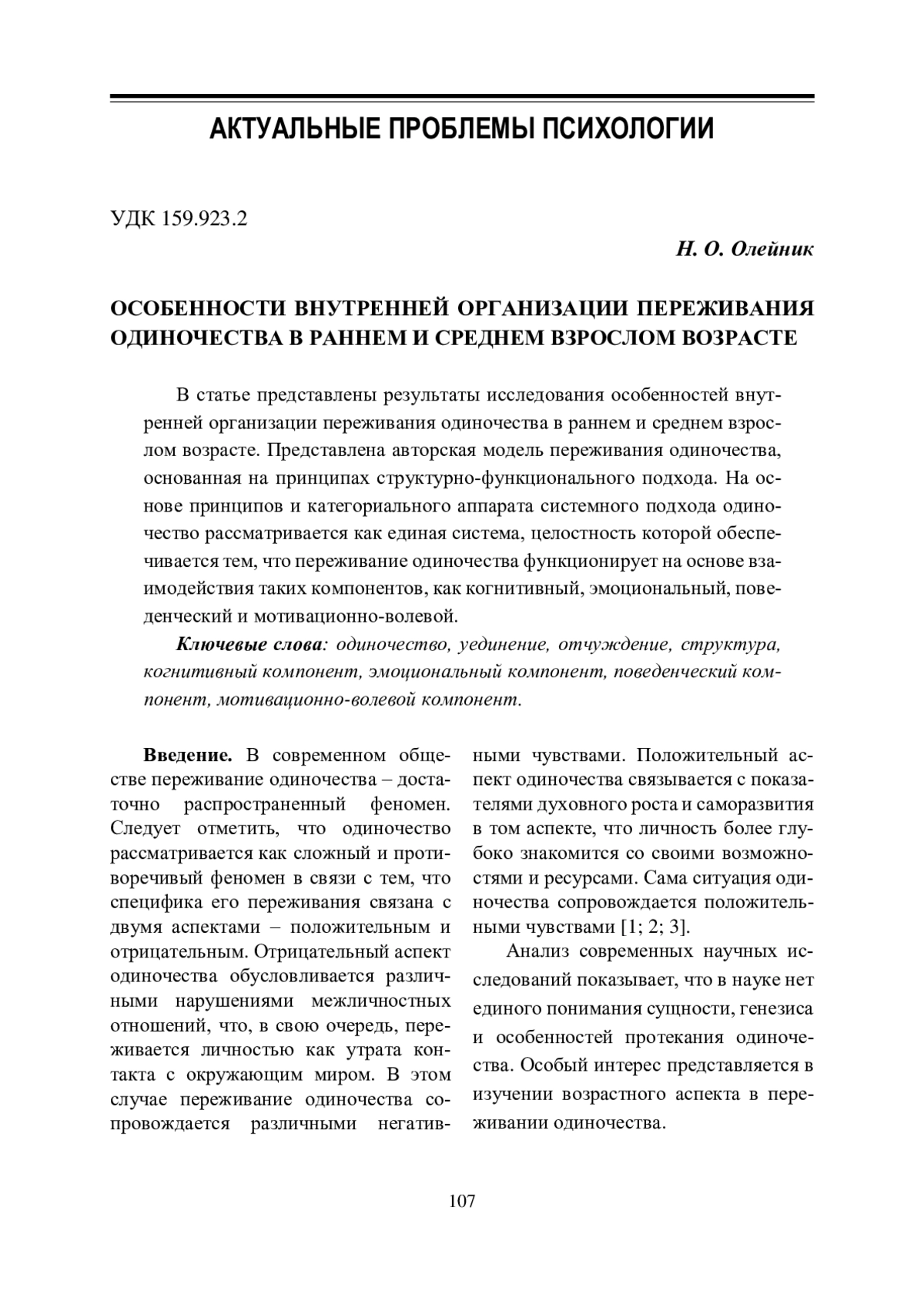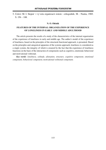 4. Олейник Н. О. Теоретическая модель переживания одиночества // Вестник Пермского университета. Философия. Психология. Социология. 2016. Вып. 2 (26). С. 104 - 110.