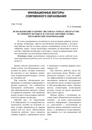 Статья: ИСПОЛЬЗОВАНИЕ РАБОЧИХ ЛИСТОВ НА УРОКАХ ЛИТЕРАТУРЫ НА ПРИМЕРЕ ПОЭМЫ Н. В. ГОГОЛЯ «МЕРТВЫЕ ДУШИ»: МЕТОДИЧЕСКИЕ РЕКОМЕНДАЦИИ (2024)