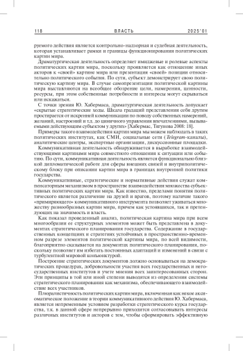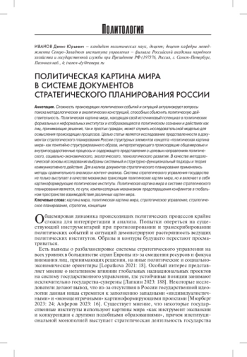Сложность происходящих политических событий и ситуаций актуализирует вопросы поиска методологических и аналитических конструкций, способных объяснить политическую действительность. Политическая картина мира, находящая свой источниковый потенциал в политических формальных и неформальных институтах и отображающаяся в политическом сознании и действиях как лиц, принимающих решения, так и простых граждан, может служить исследовательской моделью для осмысления происходящих процессов. Целью статьи является исследование представленности в документах стратегического планирования России структурных элементов концепта «политическая картина мира» как понятийно структурированного образа, интерпретирующего происходящие общемировые и внутригосударственные процессы и содержащего представления о целевых направлениях политического, социально-экономического, экологического, технологического развития. В качестве методологической основы исследования выбраны системный и структурно-функциональный подходы и теория коммуникативного действия. Для анализа документов стратегического планирования применялись методы сравнительного анализа и контент-анализа. Система стратегического управления государства не только выступает в качестве механизма трансляции политических картин мира, но и включает в себя картиноформирующие политические институты. Политическая картина мира в системе стратегического планирования является, по сути, компенсаторным механизмом предотвращения конфликтов в глобальном пространстве взаимодействия различных картин мира.