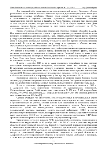 Рассмотрены причины наводнения в Амурской обл. в 2013 г. и действия органов власти, направленные на оказание помощи пострадавшему населению и организацию мер, способных ослабить негативные последствия от чрезвычайной ситуации. Рассматриваются климатические и географические факторы, способствующие возникновению паводков, включая влияние муссонных дождей и деятельность человека. Особое внимание уделено работе государственных служб, в частности МЧС России, в области ликвидации последствий наводнения, эвакуации населения и восстановления инфраструктуры. Рассматриваются меры по предотвращению подобных катастроф в будущем, включая инженерные решения, регулирование работы гидротехнических сооружений и улучшение системы информирования населения. Опыт борьбы с наводнением 2013 г. позволяет выработать эффективные стратегии для минимизации ущерба от подобных чрезвычайных ситуаций.