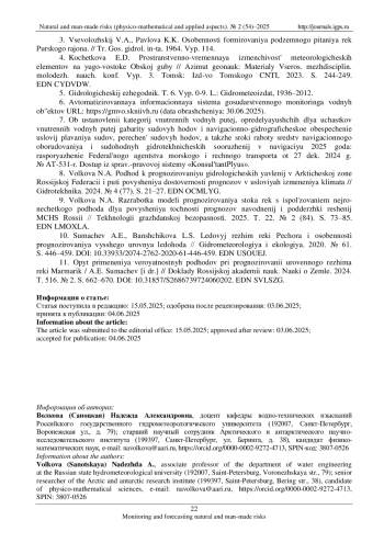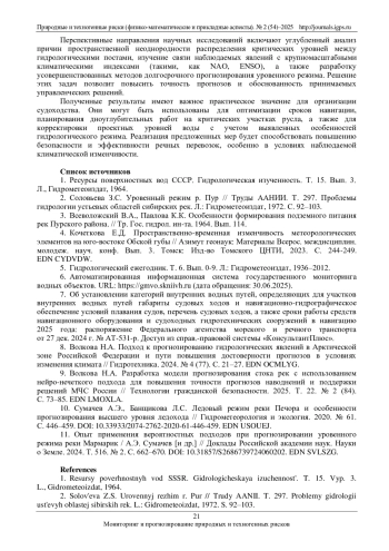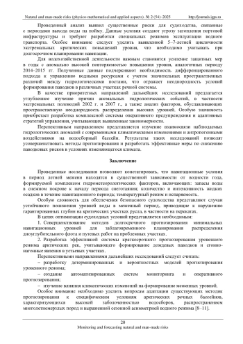 Цель исследования – анализ влияния повышенных уровней воды и выхода реки на пойму на условия судоходства, включая оценку рисков и разработку адаптационных мер. Исследование основано на анализе многолетних гидрологических данных (уровни воды) и их сопоставлении с эксплуатационными параметрами судоходства. Выявлены критические уровни воды по постам на р. Пур, при которых сокращается эффективность навигации из-за затопления знаков и смещения фарватера, скорость течения возрастает, повышая аварийность. Установлена 5–7-летняя цикличность экстремальных паводков, требующая коррекции навигационных графиков. Определены наиболее уязвимые участки (посты Тарко-Сале и Самбург), где выход на пойму приводит к ежегодным экономическим потерям. Исследование показывает необходимость интеграции гидрологического мониторинга и управленческих решений для минимизации рисков в условиях учащения экстремальных подъемов уровня воды арктических рек.