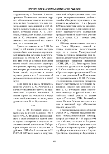 В статье сделана попытка охарактеризовать Е. Ю. Рогачеву в качестве известного деятеля педагогики и истории педагогики международного уровня, которая изучила, перевела с иностранных языков и ввела в научный оборот десятки и сотни архивных и малоизученных материалов, установила связи со многими зарубежными авторами. Вместе с этим для нас важно было отнести ее имя к той плеяде ученых, которые участвовали в кардинальной перестройке историко-педагогической науки на рубеже XX – XXI столетий, а также показать, что её роль в этом плане совершенно недооценена в нашей науке.
