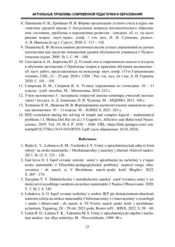 8. Панишева О. В., Еребакан И. В. Формы организации устного счета в курсе математики средней школы // Актуальные вопросы математического образования: состояние, проблемы и перспективы развития : электрон. сб. ст. по материалам всерос. науч.-практ. конф. / отв. ред. Н. В. Суханова, редкол.: А. В. Иванова [и др.]. Сургут, 2020. С. 113 - 118.