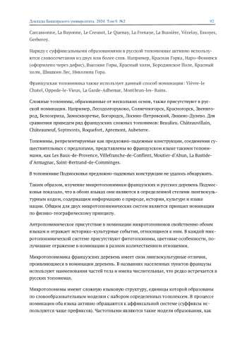 Сравнение микротопонимики французской и русской деревни представляет интерес для исследования структуры топонимической номинации и ее смыслового наполнения. Новые направления в исследовании имен собственных расширили не только семантику французских и русских микротопонимов, но и определили их словообразовательные модели, в которых можно выделить как общие, так и индивидуальные языковые характеристики. Общими чертами для структурных моделей французских и русских микротопонимов являются: прямой переход нарицательного слова в топоним, аффиксальный способ образования, словосложение и словосочетание.