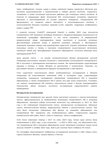 Статья посвящена применению генеративного искусственного интеллекта (ИИ) в изучении и преподавании иностранных языков. В последние годы ИИ активно внедряется в образовательный процесс, предлагая персонализированные подходы, автоматизированную оценку знаний и интерактивные методы обучения. Авторы анализируют существующие исследования и выделяют основные направления использования генеративного ИИ: чат-боты, диалоговые системы, платформы для обучения письму и адаптивные образовательные технологии. В заключение формулируются практические рекомендации для преподавателей, исследователей и образовательных организаций по интеграции генеративного ИИ в языковое образование. Работа подчеркивает важность дальнейших исследований и сотрудничества между учеными, педагогами и разработчиками технологий для эффективного использования ИИ в образовательном процессе. В качестве проблемы, особенно важной для отечественной системы образования, обозначается задача формирования этических принципов, обозначающих границы допустимого в использовании генеративного ИИ преподавателями и студентами. Методически статья выполнена в жанре систематического обзора. Критерии отбора источников включали год публикации (с 2017 по 2024 год) и тип публикаций (теоретические статьи, эмпирические исследования, обзорные статьи, технологические обзоры, редакционные мнения и дискуссионные статьи). Хотя существует значительный объем опубликованных исследований и обзоров литературы об искусственном интеллекте (ИИ) в последние годы, существующая литература, специально посвященная применению генеративного ИИ в языковом образовании, а также генеративного ИИ в целом, все еще очень ограничена. На основе проведенного обзора в статье сформулирован ряд рекомендаций. Во-первых, педагогическим работникам стоит рассмотреть возможность включения инструментов генеративного ИИ в свою педагогическую практику, оставаясь при этом бдительными и внимательными к потенциальным рискам. Непрерывное профессиональное развитие имеет решающее значение для обеспечения обоснованных решений и эффективной интеграции инструментов генеративного ИИ. Во-вторых, исследователям необходимо продолжать эмпирические исследования эффективности и влияния инструментов генеративного ИИ для развития конкретных языковых навыков и вовлечения заинтересованных сторон в ответственную интеграцию. Наконец, обществу в целом стоит учитывать, что влияние генеративного ИИ выходит за рамки языкового образования; важно рассматривать его интеграцию в другие предметные области.