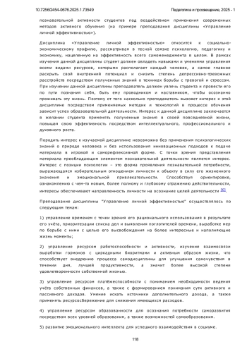 В научной статье рассматривается опыт применения активных методов обучения в процессе преподавания дисциплины «Управление личной эффективностью» для студентов первого курса Читинского института Байкальского государственного университета. Объектом исследования стало изучение технологии обучения студентов управлению личной эффективностью, что включало в себя разработку и апробацию последовательности применения психолого-педагогических приёмов и методов, встраиваемых в технологическую карту прохождениями основных разделов изучения данной дисциплины. Предметом исследования стало применение методов активного обучения в процессе изучения данной дисциплины. Целью исследования является изучение познавательной активности студентов под воздействием применения современных методов активного обучения. Областью применения результатов исследования является такой раздел общей педагогики как педагогическая технология. Для достижения цели и решения поставленных задач был проведён опрос студентов для оценки степени их интереса и познавательной активности в процессе изучения дисциплины, который выявил высокий уровень их заинтересованности и мотивации к улучшению всех сфер своей жизнедеятельности, а также продемонстрировал какие методы активного обучения являются более действенными. Для проведения исследования использовались методы обобщения, социологических исследований в виде проведенного опроса студентов, а также методы анализа и синтеза полученной в ходе анкетирования информации. Научная новизна данного исследования носит научно-практический характер для разработки рекомендаций по выбору наиболее эффективных методов активного обучения с целью развития познавательной активности студентов в изучении дисциплины “Управление личной эффективностью”. В результате исследования были выявлены наиболее интересующие студентов разделы изучения дисциплины, которые на сегодняшний момент находят больший отклик, определена эффективность использования активных методов обучения в процессе её изучения. Все сделанные выводы по результатам исследования должны стать основанием для внесения изменений в технологическую карту процесса обучения. Проведённое исследование также продемонстрировало актуальность и значимость преподавания данной дисциплины для молодёжи, новой генерации общества, так как развитие государства зависит от личного вклада каждого, а социально-экономическое развитие общества - от повышения личной эффективности каждого индивида.