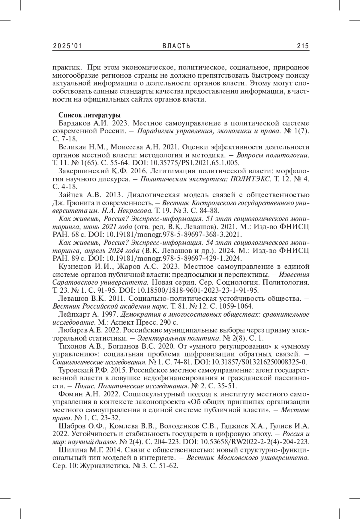 1. Бардаков А.И. 2023. Местное самоуправление в политической системе современной России. - Парадигмы управления, экономики и права. № 1(7). С. 7-18. EDN: WITJDB