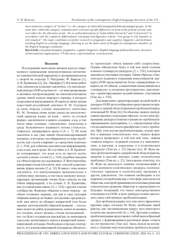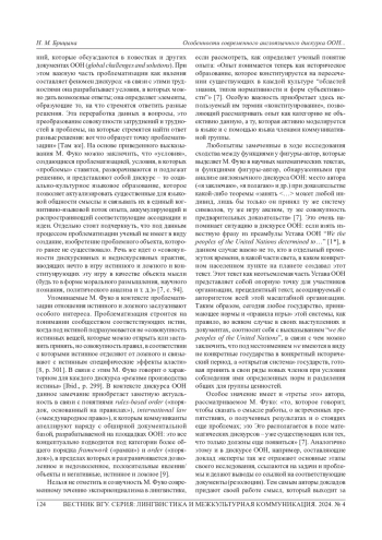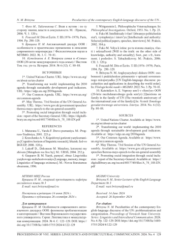 9. Брицына Н М. Англоязычный дискурс ООН: особенности и практическое применение в описании современного миропорядка // Филологические науки в МГИМО. 2022. №. 3. С. 70-81. EDN: RLAKAM