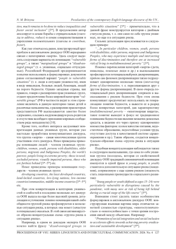 Как уже отмечалось ранее, конструируемый круг проблем в англоязычном дискурсе ООН неразрывно связан с категориями «жертв». Здесь следует выделить следующие варианты их номинации: “vulnerable groups”, а также “marginalized groups” и “disadvantaged groups” (т. е. уязвимые, социально отчужденные). Российской Федерацией предпринимаются попытки использовать в формулировках документов ранее согласованный вариант “people in vulnerable situations” (т. е. люди в ситуации уязвимости), имея в виду инвалидов, больных людей, беженцев, людей на пороге бедности. Однако западные страны, как правило, говоря о расширении прав уязвимых групп, отдают предпочтение более широкой категории “vulnerable groups” (РФ в частности видит в этом стремление включить в данную категорию также детей и различные меньшинства, о расширении прав которых представители РФ высказываются заметно более сдержанно, ссылаясь на руководящую роль родителя и отсутствие всеобщего признания мировым сообществом ряда меньшинств) [10].