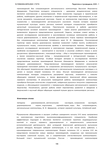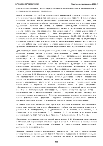 В статье рассматриваются особенности дирижирования хоровых произведений без сопровождения регионального композитора Василия Ивановича Шардакова. Подготовка молодого специалиста - дирижера академическим хором является комплексной и разносторонней. Имея множество подходов в практической работе, необходимо уделять внимание и теоретической подготовке обучающихся, в том числе расширять музыкальный кругозор. Одним из компонентов подготовки является знакомство с произведениями регионального значения. Знание истории хоровой музыкальной культуры своего региона поможет молодым специалистам приобрести целостный музыкальный кругозор. Пристальное внимание в работе уделяется методическим основам освоения произведений - через анализ дирижерского плана выявляются трудности представленных рукописей. Задачи, которые ставят авторы в данном исследовании заключаются в рассмотрении основных компонентов работы в классе дирижирования, а также анализе дирижерского плана хоровых произведений без сопровождения композитора Алтайского края В. И. Шардакова. Рассмотрение партитур через призму дирижерских приемов позволяет глубже понять особенности музыкального языка, стилистические приёмы и композиторские техники. Методология данного исследования заключается в комплексном подходе: теоретический подход к проблеме исследования - заключается в изучении и анализе учебного плана и роли дисциплины «Дирижирование», поисковый метод - сбор и популяризация произведений, а также конкретно-научный метод - музыковедческий и методический подходы к изучению хоровых партитур. Особым вкладом авторов в исследование является представление анализа произведений Василия Ивановича Шардакова в контексте методики дирижирования. Представленные произведения являются результатом проводимой поисковой работы по сохранению регионального музыкального наследия. Это обогащает теоретические представления о региональном музыкальном наследии и в целом о музыке второй половины XX века. Изучая произведения региональных композиторов молодые специалисты расширяют кругозор, знакомятся с новыми образцами хоровой культуры, а также формируется творческий облик дирижера хорового коллектива. В результате проводимой работы произведения композитора приобрели большее количество слушателей, найденные рукописи получили современное издание, а обучающиеся знакомятся с прекрасными образцами регионального хорового творчества. Несомненно, данная работа имеет перспективы развития и введение в творческий и научный оборот образцов хоровой музыки других композиторов региона.