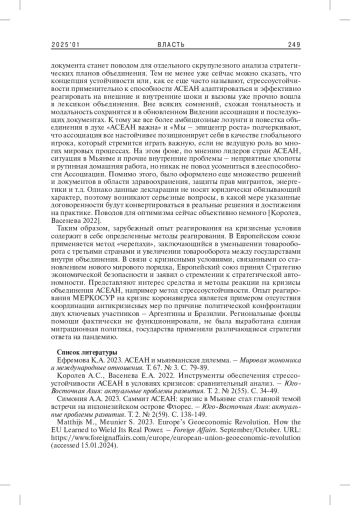 2. Королев А.С., Васенева Е.А. 2022. Инструменты обеспечения стрессоустойчивости АСЕАН в условиях кризисов: сравнительный анализ. - Юго-Восточная Азия: актуальные проблемы развития. Т. 2. № 2(55). С. 34-49. EDN: KCZFXS