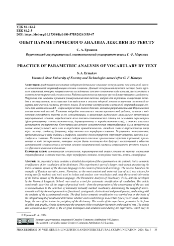 Представленная статья содержит детальное описание эксперимента по системной лексико-семантической стратификации лексики словника. Данный эксперимент является частью более крупного изыскания, которое направленно на исследование лексико-семантической системы русского языка в контексте исторической лексикологии. Работа выполнена на примере русской повествовательной прозы. Нарратив, как наиболее древний и универсальный тип текста, выбран для апробации конкретных методов и инструментов, используемых для выделения и анализа ядерной лексики и изучения системной иерархии лексической системы русского языка. В качестве инструмента системной стратификации лексики был использован ПАЛ - Параметрический Анализ Лексики, активно разрабатываемый Воронежской лингвистической школой. В статье подробно описаны все этапы практической работы, начиная с подготовки конкорданса текста и его лемматизации, и заканчивая выделением минимально текстуально маркированной лексики, определением веса лексико-семантических единиц по основным параметрам (функциональному, синтагматическому, деривационному и парадигматическому), а также анализом результатов эксперимента. Окончательная лексико-семантическая стратификация была проведена на основе интегрального веса слов и определяет принадлежность каждого слова к определенному типу ядра: малому, среднему, большому, ядру текста или периферии словника. Результаты эксперимента, представленные в виде таблиц и графиков, наглядно демонстрируют структуру иерархии лексики в исследуемом словнике. В статье также содержится описание оригинальных приемов и решений, примененных в ходе эксперимента, которые могут быть полезными для будущих исследований в области исторической лексикологии и изучения лексико-семантической системы современного русского языка в его функционировании и динамике.
