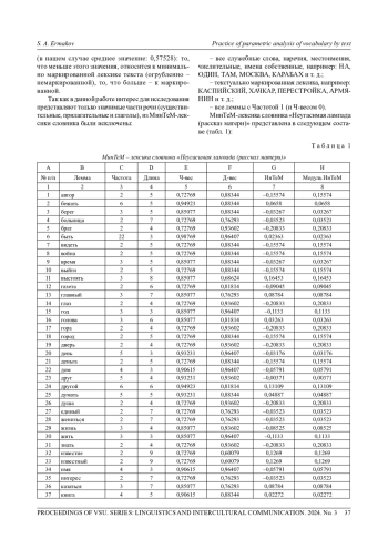 При подготовке словника к параметрическому анализу, прежде всего, необходимо создать его конкорданс – «упорядоченный список всех словоформ (или слов), с указанием их вхождений в заданный массив текстов» [4, с. 73]. Конкорданс отображает полный текст словника, и для каждой словоформы приводится контекст, который иллюстрирует ее использование, что является весьма полезным и востребованным в дальнейшей работе. Важно отметить, что количество слов в конкордансе должно строго соответствовать количеству слов в словнике. Так, во избежание потери слов при создании конкорданса нам пришлось прибегнуть к удалению всех знаков тире из текста перед его конвертацией компьютерными программами.