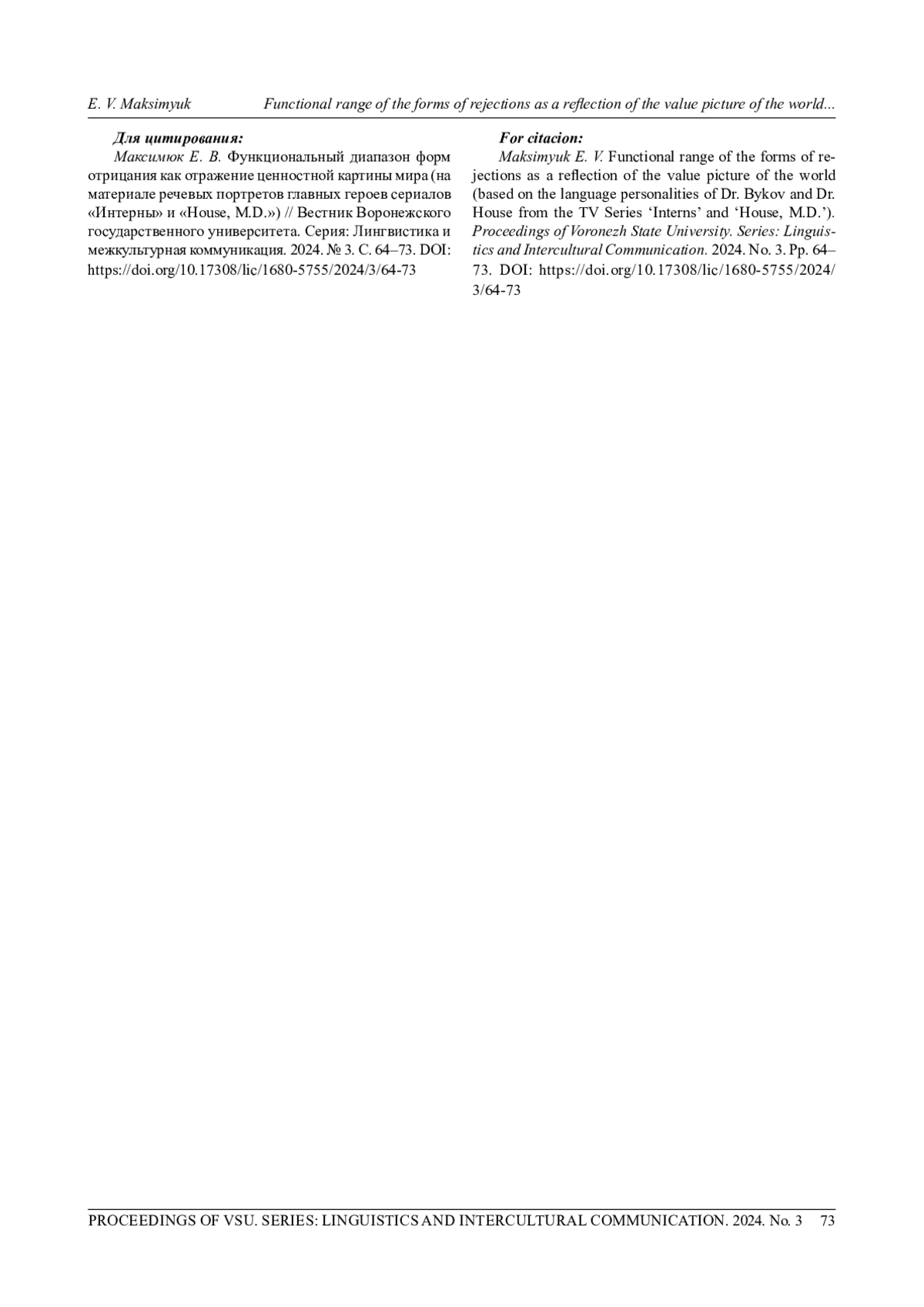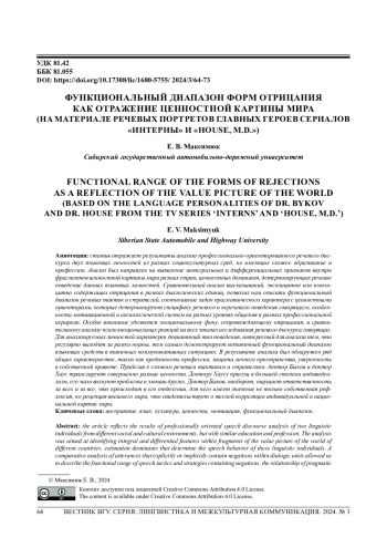 Статья отражает результаты анализа профессионально-ориентированного речевого дискурса двух языковых личностей из разных социокультурных сред, но имеющих схожее образование и профессию. Анализ был направлен на выявление интегральных и дифференциальных признаков внутри фрагментов ценностной картины мира разных стран, ценностных доминант, детерминирующих речевое поведение данных языковых личностей. Сравнительный анализ высказываний, эксплицитно или имплицитно содержащих отрицания в рамках диалогических единиц, позволил нам описать функциональный диапазон речевых тактик и стратегий, соотношение задач прагматического характера с ценностными ориентирами, которые детерминируют специфику речевого и неречевого поведения говорящего, особенности мотивационной и аксиологической систем на разных уровнях общения в рамках профессиональной иерархии. Особое внимание уделяется эмоциональному фону, сопровождающему отрицания, и сравнительному анализу психоэмоциональных реакций на всех этапах исследования речевого дискурса говорящих. Для анализируемых личностей характерен девиантный тип поведения, интересный для анализа тем, что регулярно выходит за рамки нормы, тем самым демонстрирует нетипичный функциональный диапазон языковых средств в типичных коммуникативных ситуациях. В результате анализа был обнаружен ряд общих характеристик, таких как преданность профессии, защита личного пространства, уверенность в собственной правоте. Прибегая к схожим речевым тактикам и стратегиям, доктор Быков и доктор Хаус транслируют совершенно разные ценности. Доктору Хаусу присущ в большей степени индивидуализм, его мало волнуют проблемы и эмоции других. Доктор Быков, наоборот, ощущает ответственность за всех и за все, что происходит в его отделении, для него имеет значение не только собственная рефлексия, но рецепция внешнего мира, что свидетельствует о тесной корреляции индивидуальной и национальной картин мира.