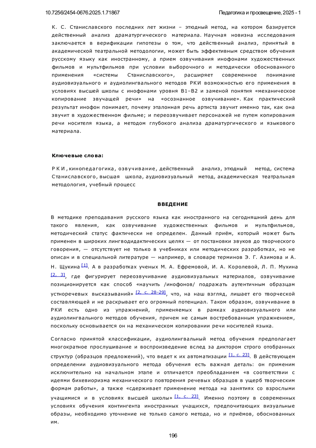 В статье представлены возможности интеграции действенного анализа, принятого в академической театральной методологии, и его главной составляющей - этюдного метода - в практику РКИ. Автор предлагает качественно новый уровень озвучивания инофонами художественных фильмов и мультфильмов, основанный на понимании природы конфликта каждой сцены, предлагаемых обстоятельств, психологии взаимоотношений персонажей, их характеров, мотивов, сверхзадачи. Обозначенные положения стали предметом исследования авторской программы «Я понимаю!», прошедшей апробацию в 6 вузах России и КНР. В статье представлены алгоритмы работы программы, а также варианты заданий и разборов на примере рассмотренного в учебнике «Я понимаю!» фильма Олега Янковского по мотивам пьесы Надежды Птушкиной «Приходи на меня посмотреть». В статье рассматриваются возможности применения основных положений «системы Станиславского» на уроках русского языка как иностранного в ходе работы со студентами-инофонами уровня В1-В2 над озвучиванием художественных фильмов и мультфильмов. За основу взято изобретение К. С. Станиславского последних лет жизни - этюдный метод, на котором базируется действенный анализ драматургического материала. Научная новизна исследования заключается в верификации гипотезы о том, что действенный анализ, принятый в академической театральной методологии, может быть эффективным средством обучения русскому языку как иностранному, а прием озвучивания инофонами художественных фильмов и мультфильмов при условии выборочного и методически обоснованного применения «системы Станиславского», расширяет современное понимание аудиовизуального и аудиолингвального методов РКИ возможностью его применения в условиях высшей школы с инофонами уровня В1-В2 и заменой понятия «механическое копирование звучащей речи» на «осознанное озвучивание». Как практический результат инофон понимает, почему эталонная речь артиста звучит именно так, как она звучит в художественном фильме; и переозвучивает персонажей не путем копирования речи носителя языка, а методом глубокого анализа драматургического и языкового материала.