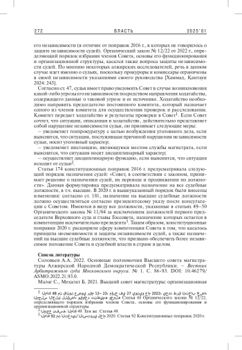 1. Соловьев А.А. 2022. Основные полномочия Высшего совета магистратуры Алжирской Народной Демократической Республики. - Вестник Арбитражного суда Московского округа. № 1. С. 86-93. DOI: 10.46279/ASMO.2022.21.93.0