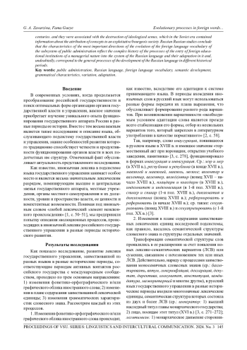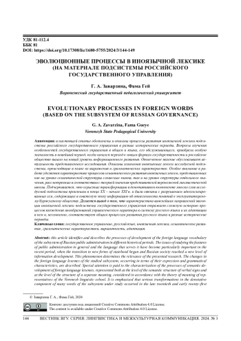 В настоящей статье обозначены и описаны процессы развития иноязычной лексики подсистемы российского государственного управления в разные исторические периоды. Вопросы изучения особенностей государственного управления в общем и языка, его обслуживающего, приобрели особую значимость в новейший период, когда начался переход к новым формам государственности и российское общество вышло на новый уровень информационного развития. Отмеченное явление обусловливает актуальность представленного исследования. Описаны изменения иноязычных лексем исследуемой подсистемы, происходящие в плане их выражения и грамматических характеристик. Особое внимание в работе уделяется характеристике процессов семантического развития иноязычных лексем, представленных как на уровне семантической структуры словесных знаков, так и на уровне структуры отдельного значения, рассмотренных в соответствии с теорией значения представителей воронежской лингвистической школы. Подчеркивается, что серьезные трансформации в денотативном компоненте многих слов исследуемой подсистемы произошли в конце ХХ - начале XXI в. и были связаны с разрушением идеологизированных сем, содержащих в советскую эпоху информацию об отнесенности понятий к эксплуататорскому/буржуазному обществу. Делается вывод о том, что характеристика важнейших направлений эволюции иноязычной лексики подсистемы государственного управления отражает сложную историю процессов вхождения инообразований управленческого характера в систему русского языка и их адаптации в нем и, несомненно, соответствует общим процессам развития русского языка в разные исторические периоды.