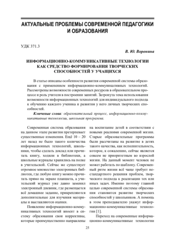 1. Кудрань В. А. Специфика развития творческих способностей подростков в условиях применения информационных технологий // Педагогический журнал. 2019. Т. 9. № 1-1. С. 290 - 298.