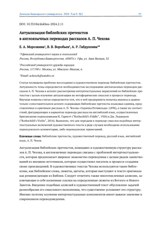 Статья посвящена проблеме воссоздания в художественном переводе библейских претекстов. Актуальность темы определяется необходимостью исследования англоязычных переводов рассказов А. П. Чехова в аспекте рассмотрения интертекстуальных вкраплений из библейских претекстов с целью изучения актуализации их метафорических смыслов в процессе перевода. Научная новизна статьи определяется тем, что в ней предпринята попытка анализа в сравнительно-сопоставительном аспекте содержащих библейские претексты языковых единиц, представленных в оригинале рассказа А. П. Чехова «Скрипка Ротшильда» (1894), а также их соответствий, фигурирующих в вариантах перевода рассказа на английский язык, осуществленных британскими переводчиками К. Гарнетт (“Rothschild’s Fiddle”, 1920) и Дж. Леджером (“Rothschild’s Violin”, 2014). Выявлено, что для передачи в переводе смыслов подобных интер- текстуальных включений художественного текста в ряде случаев необходимо использование переводческого комментария, либо переводческих примечаний.