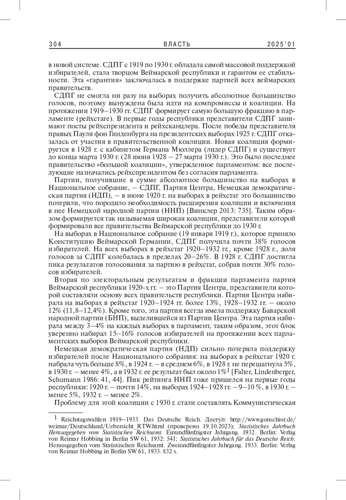История Веймарской республики, проблемы социально-политических и экономических трансформаций этого периода в контексте падения Веймарской республики и прихода к власти национал-социалистов являются одними из самых востребованных тем в историографии [Кретинин, Шульц 2023a; Кретинин, Шульц 2023б; Шульц 2018].