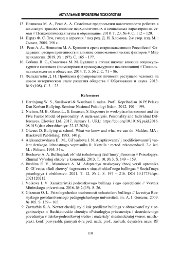 13. Новикова М. А., Реан А. А. Семейные предпосылки вовлеченности ребенка в школьную травлю: влияние психологических и социальных характеристик семьи // Психологическая наука и образование. 2018. Т. 23. № 4. С. 112 - 120.