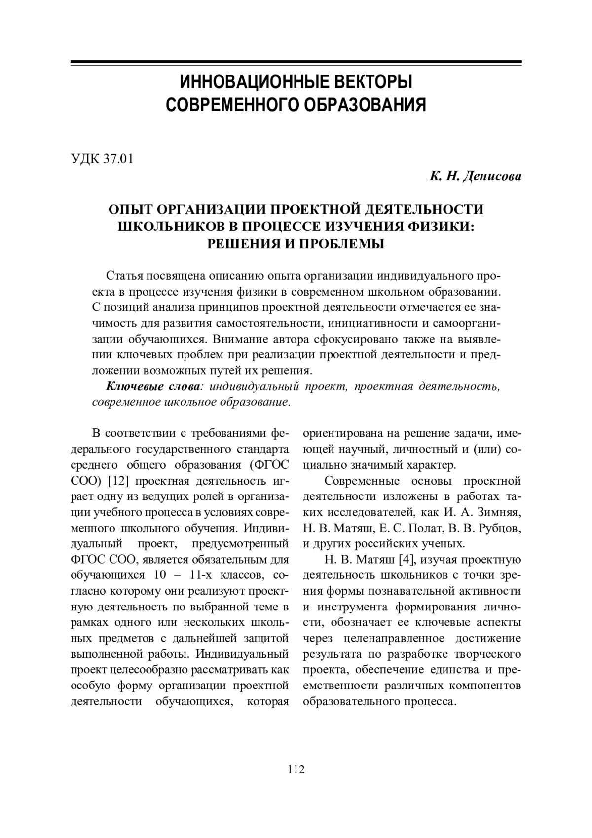 Статья посвящена описанию опыта организации индивидуального проекта в процессе изучения физики в современном школьном образовании. С позиций анализа принципов проектной деятельности отмечается ее значимость для развития самостоятельности, инициативности и самоорганизации обучающихся. Внимание автора сфокусировано также на выявлении ключевых проблем при реализации проектной деятельности и предложении возможных путей их решения.