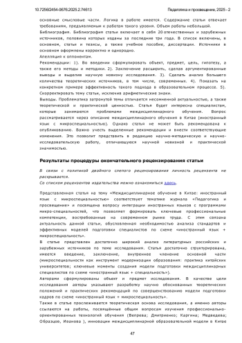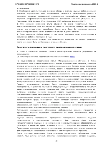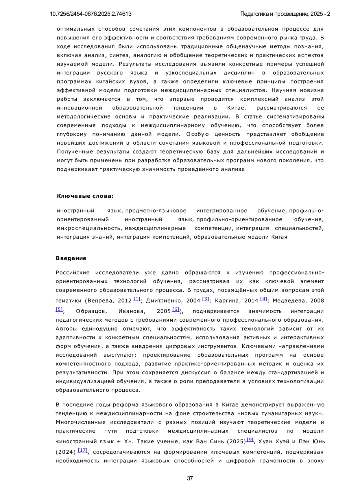 11. Гу Сяолэ. Исследование построения междисциплинарного педагогического сообщества по модели “иностранный язык + специальность” с точки зрения экологии образования // Иностранные языки в мире. 2025. № 1. С. 73-80. (顾晓乐. 教育生态视域下“外语+专业“跨学科教学共同体构建研究[J]. 外语界). 2025. № (1). С. 73-80.