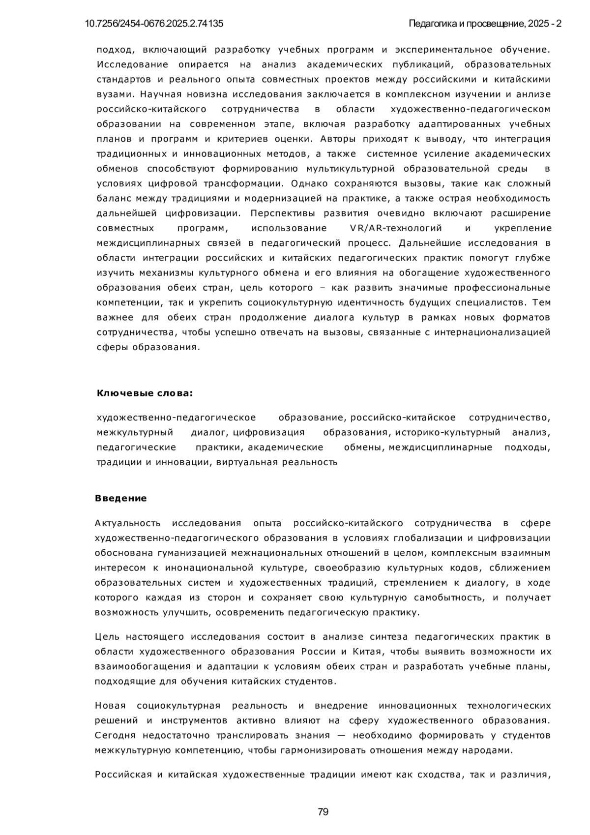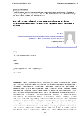 Статья посвящена анализу российско-китайского сотрудничества в сфере художественно-педагогического образования в условиях современной глобализации и ускоренной цифровизации. Исследуются ключевые исторические, культурные и педагогические аспекты взаимодействия двух крупнейших стран, включая влияние классической советской системы образования на китайскую художественную школу, также актуальные современные тенденции, такие как интеграция цифровых технологий и искусственного интеллекта, междисциплинарные подходы и кросс-культурные исследования, академические обмены и стажировки. Особое внимание уделено детальному сравнительному анализу педагогических практик России и Китая, системному выявлению их сильных сторон и конкретным возможностям для взаимного обогащения. Авторы рассматривают, как традиционные методы обучения органично сочетаются с инновационными подходами, также как культурные различия непосредственно влияют на формирование современных образовательных стратегий. В работе методы историко-культурного анализа, сравнительной педагогики, а также практико-ориентированный подход, включающий разработку учебных программ и экспериментальное обучение. Исследование опирается на анализ академических публикаций, образовательных стандартов и реального опыта совместных проектов между российскими и китайскими вузами. Научная новизна исследования заключается в комплексном изучении и анлизе российско-китайского сотрудничества в области художественно-педагогическом образовании на современном этапе, включая разработку адаптированных учебных планов и программ и критериев оценки. Авторы приходят к выводу, что интеграция традиционных и инновационных методов, а также системное усиление академических обменов способствуют формированию мультикультурной образовательной среды в условиях цифровой трансформации. Однако сохраняются вызовы, такие как сложный баланс между традициями и модернизацией на практике, а также острая необходимость дальнейшей цифровизации. Перспективы развития очевидно включают расширение совместных программ, использование VR/AR-технологий и укрепление междисциплинарных связей в педагогический процесс. Дальнейшие исследования в области интеграции российских и китайских педагогических практик помогут глубже изучить механизмы культурного обмена и его влияния на обогащение художественного образования обеих стран, цель которого - как развить значимые профессиональные компетенции, так и укрепить социокультурную идентичность будущих специалистов. Тем важнее для обеих стран продолжение диалога культур в рамках новых форматов сотрудничества, чтобы успешно отвечать на вызовы, связанные с интернационализацией сферы образования.