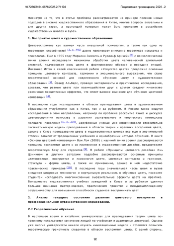 Цвет является одним из ключевых элементов визуального искусства, играя важную роль в передаче эмоций и создании художественных образов. Предметом исследования: Современные подходы к развитию цветовосприятия в профессиональном художественном образовании, включая интеграцию цифровых технологий и совершенствование методик обучения. Актуальность исследования обусловлена необходимостью интеграции новых технологий, таких как виртуальная реальность и цифровые платформы, а также разработки объективных критериев оценки. Цель статьи - проанализировать современное состояние преподавания цветовосприятия в художественном образовании и предложить пути его совершенствования. Для достижения данной цели необходимо решить следующие задачи: рассмотреть теоретические и практические аспекты обучения цвету, выявить проблемы в оценке и обратной связи, разработать рекомендации по внедрению цифровых технологий и обновлению учебных программ, предложить меры по улучшению подготовки преподавателей. Методология исследования: Использован комплексный подход, включающий теоретический анализ научной литературы по проблеме цветовосприятия, сравнительное исследование традиционных и современных методов обучения, анализ практического опыта внедрения цифровых технологий в образовательный процесс. Особое внимание уделено изучению опыта китайских учебных заведений в данной области. Новизна исследования, выводы: В данной статье дан системный анализ современного состояния и существующих проблем в сфере развития цветовосприятия в профессиональном художественном образовании, а также показана важная роль цвета как интуитивного и выразительного визуального языка в творчестве и преподавании искусства. Впервые выполнен комплексный анализ современных методов обучения цветовосприятию с учетом цифровых инноваций. Разработаны практические рекомендации по модернизации учебных программ, внедрению цифровых технологий и совершенствованию системы оценки для китайских художественных учебных заведений. Показана эффективность сочетания традиционной теории цвета с современными концепциями дизайна и применением цифровых платформ. Полученные результаты могут быть использованы в художественных школах и вузах различных стран для повышения качества подготовки специалистов в области визуальных искусств.