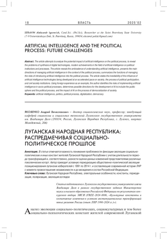 В статье предприняты попытки проанализировать потенциал воздействия искусственного интеллекта на политический процесс, раскрыть проблематику синтеза цифровых технологий, современных достижений в сфере искусственного интеллекта на политические институты и процессы. В статье раскрывается амбивалентность понимания искусственного интеллекта, представлены основные направления управления искусственным интеллектом в контексте политического процесса, обобщаются функции управления рисками внедрения искусственного интеллекта в политический процесс. В статье констатируется неизбежность влияния разрабатываемых опережающими темпами технологий искусственного интеллекта на общество, процесс политического участия, институты гражданского общества. В статье на примере зарубежного опыта выявлются риски имплементации искусственного интеллекта в социально-политические процессы, определяются возможные направления развития ИИ для включения в публичную сферу и политический процесс, влияния ИИ на процесс демократизации общества.